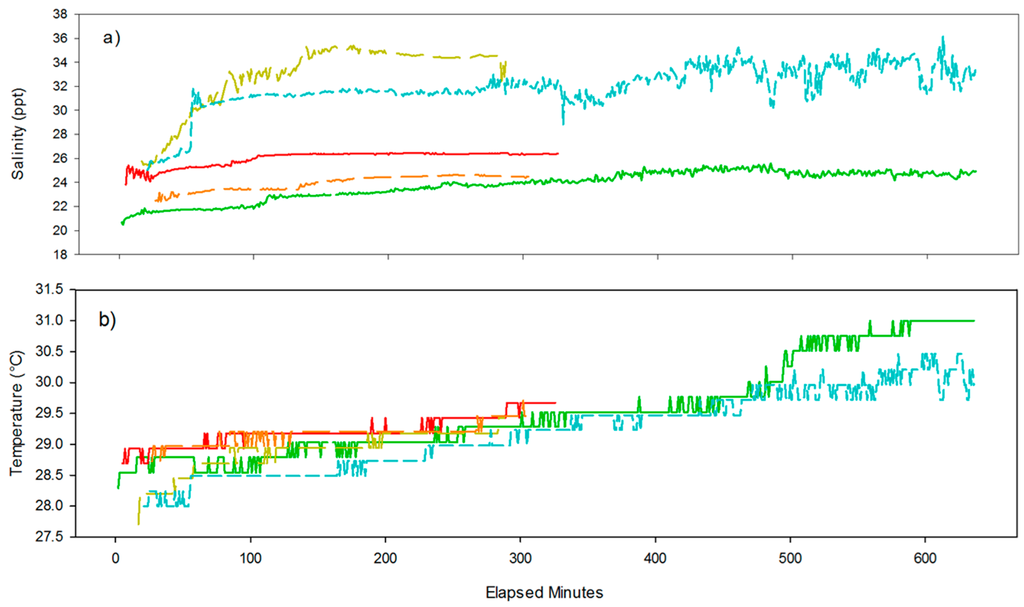 Salinity (a) and temperature (b) readings from drifters 10–14 during deployment on September 4th 2015 across the mouth of Mobile Bay, Alabama. The color scheme is the same as Figure 2.