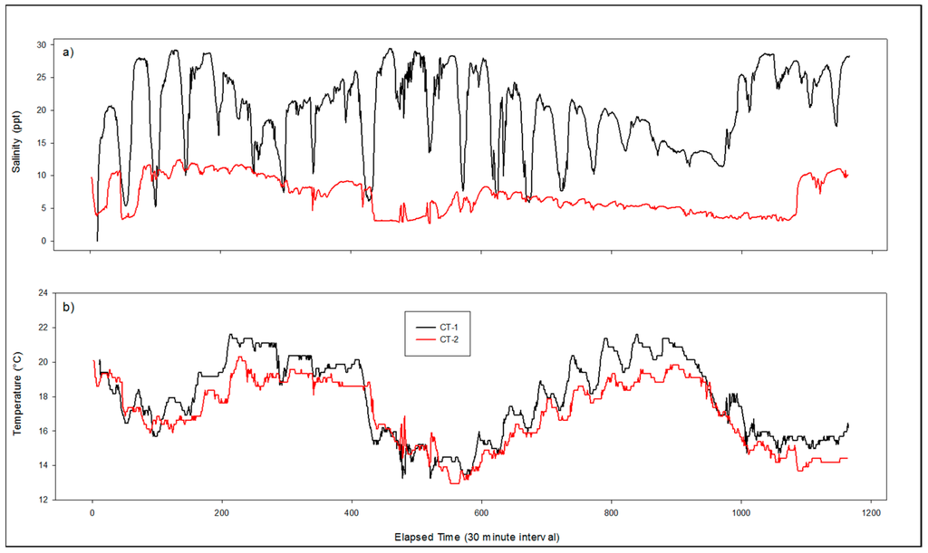 Two conductivity and temperature data loggers (CT) using the moored application design were deployed for a total of 24 days from 13 November 2015 to 7 December 2015. CT-1 was deployed in West Fowl River (30°21.742 N, 88°10.434 W), while CT-2 was deployed at Bellingrath Gardens (30°25.716 N, 88°8.138 W). Both locations can be seen in Figure 2 above. Salinity and temperature measurements were taken every 30 min and the results can be viewed in Figure 8. Salinity was consistently higher at the CT-1 site while temperatures at both CT-1 and CT-2 tracked similarly over the entire deployment.