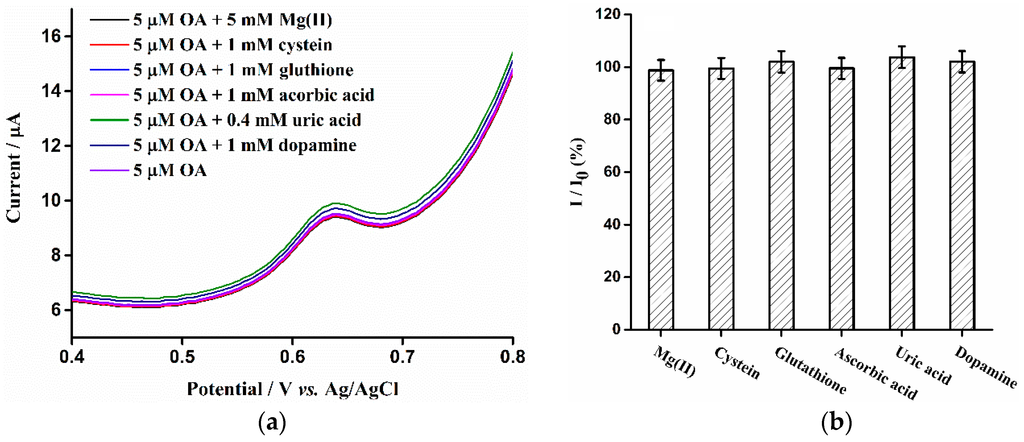 The interferences resulting from foreign substances on the oxidation peak current of OA and TA at the surface of ERGO/GCE sensor under the optimum conditions was also studied by DPV measurements. Referring to the works of Raoof’s group [26,27], possible interfering substances which are abundant in biological samples including Mg2+, cysteine, ascorbic acid (AA), dopamine and glutathione and uric acid (UA) were selected. As shown in Figure 8a,c, no significant change of the DPV anodic peak current of OA and TA in the presence of interferents was observed. Besides, the ratio (%) between the oxidation peak current of OA (Figure 8b) and TA (Figure 8d) in the presence (I) and absence (I0) of the interferences is in the range of 95% to 105%, which further indicates that the interferences have almost no influence on the oxidation peak current of OA and TA at the surface of the sensor. In these experiments, the concentrations of interfering substances used in the detection of 5 μM (OA) and TA were 5 mM for Mg2+, 1 mM for cysteine, AA, dopamine and glutathione, and 0.4 mM for UA. It proves that ERGO-GCE can be regarded as a good electrochemical sensor for recognition of OA and TA.