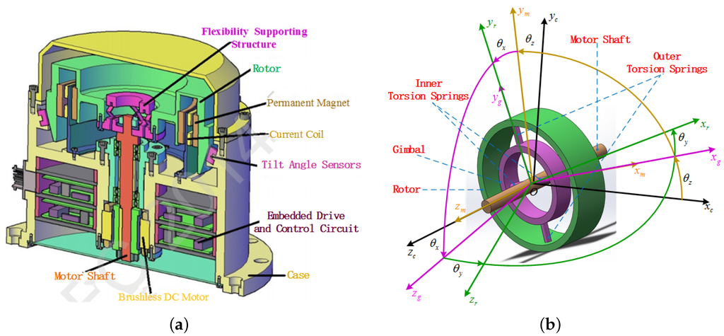 Previous research has demonstrated that according to the difference of the gyro rotor support, the integrated devices combining both attitude-sensing and the attitude-control can be roughly divided into two categories: the magnetically-suspended double-gimbal control moment gyroscope (CMG) (MSDGCMG) [4,5,6] and the integrated device-based gimbal support structure represented by a gyrowheel (GW) [7,8]. The former MSDGCMG supports the rotor by active magnetic bearings (AMBs) [9,10]. The latter GW is developed based on the principle of a dynamically-tuned gyroscope (DTG) by Bristol Aerospace Company for the Canadian Space Agency’s SCISAT-1 Scientific in 2003, and the GW rotor is supported by crossed torsion springs and a gimbal. The MSDGCMG implements the functions of the two degrees of freedom (DOF) torque output and two-axis angular rate sensing in two different operation modes [3,11], so that it can only implement a type of function at some point. However, unlike MSDGCMG, the GW not only has the ability for 3-DOF torque output and two-axis angular rate sensing, but also can implement both functions at the same time because of its simple structure.