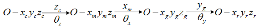 The simplified structure and the respective body frames of GW are shown in Figure 1b. The four body frames are case frame(:O-), motor body frame (:O-), gimbal body frame (:O-) and rotor body frame (:O-), respectively. And Figure 2 shows the angular position relationship of these four body frames. The rotation angles in Figure 1a and Figure 2 are defined as chosen generalized coordinates for GW and can represent the motion about the three degrees of freedom of the GW system. They will be applied to derive the dynamical model of GW using Lagrange’s equations and can be termed as spinning coordinates [2].