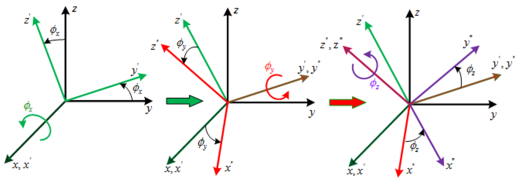where , represent the rotation matrix of about the x-axis,-axis and -axis, respectively, and , , .
