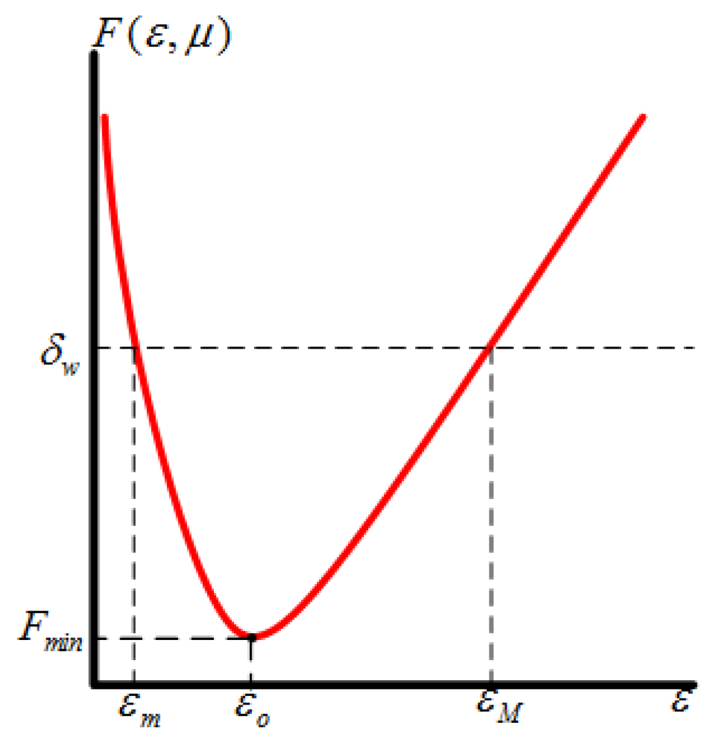 From Equation (45) we can find that: (1) is strictly decreasing for , where , strictly increasing for , and has a global minimum for at ; (2) For any given observation accuracy requirement , for , and the equation has two solutions at and : For , we have the following relationship: