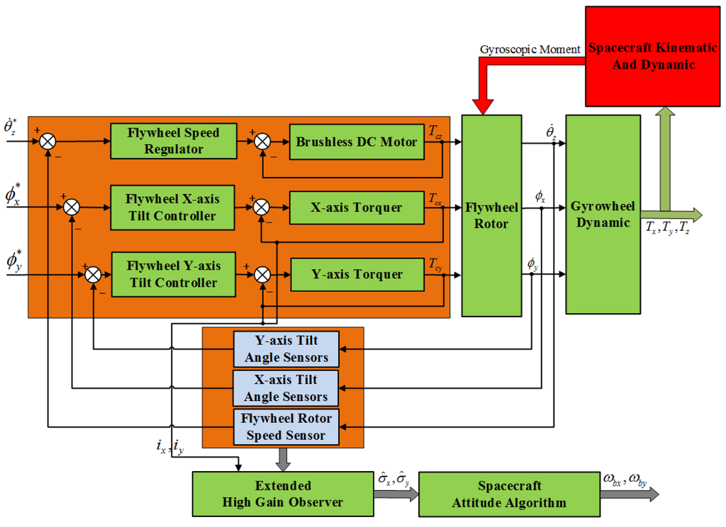 In Figure 5, the variables are the inputs of the motor control loop, the x-axis and the y-axis tilt control loop of the GW, respectively. The variables are the corresponding measurable outputs of the above three control loops of the GW, respectively. The variables are the control torque outputs of the above three control loops of the GW, respectively. The variables are the measurable current outputs from the x-axis and the y-axis torquer, respectively. The relationship between and is given by , respectively. The variables acting on the spacecraft are the three-axis control torque outputs of the GW. The estimates are the extended observer states, which represent the estimates of the related terms of the spacecraft angular motion in the GW dynamics equations along the x-axis and y-axis, respectively. The variables are the calculated values of spacecraft angular rates through the estimates of the EHGO and the spacecraft attitude algorithm. According to the above description, the spacecraft attitude algorithm in Figure 5 can be expressed by: