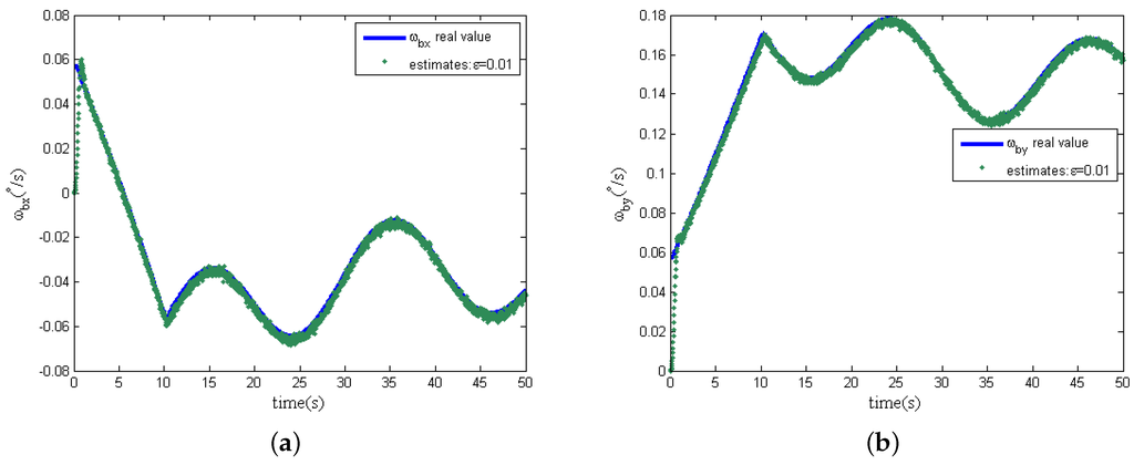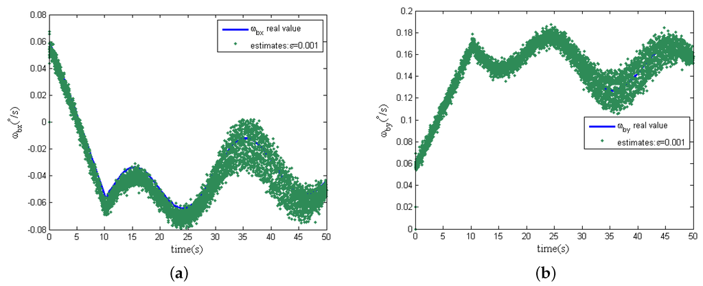 Further more, in the following simulation, measurement noise in the two dimensional tilt angle sensors is considered. The magnitudes of measurement noise in the tilt angle sensors are assumed to be uniformly distributed random variables taking values between and , and the time interval of these random values variation is s. In addition, the other simulation conditions remain unchanged, and the estimation curves of the spacecraft angular are shown in Figure 7a,b when the design parameter ε is chosen as and , respectively.