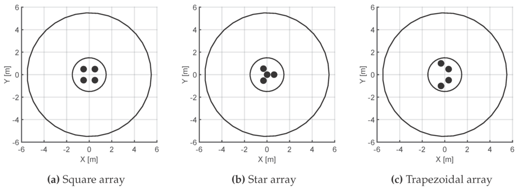 In this section we will analyze different antenna deployments and study the performance of each configuration in terms of accuracy and dispersion of the position of the source by simulation. We assume that there is a strong line-of-sight and that reflections are attenuated and delayed in such a way that they do not interfere in the free-space assumption. Also, we work under the premise that all other errors and uncertainty sources described in the last Section will be encompassed in a single error parameter given by the sampling time, , of the PD signal. Then, the target of this Section is to evaluate what antenna array is best under the same conditions independently of the nature of the error. Under these circumstances, the results will show that choosing an appropriate layout can reduce the uncertainty in the location of the source due to errors in the TDOA.
