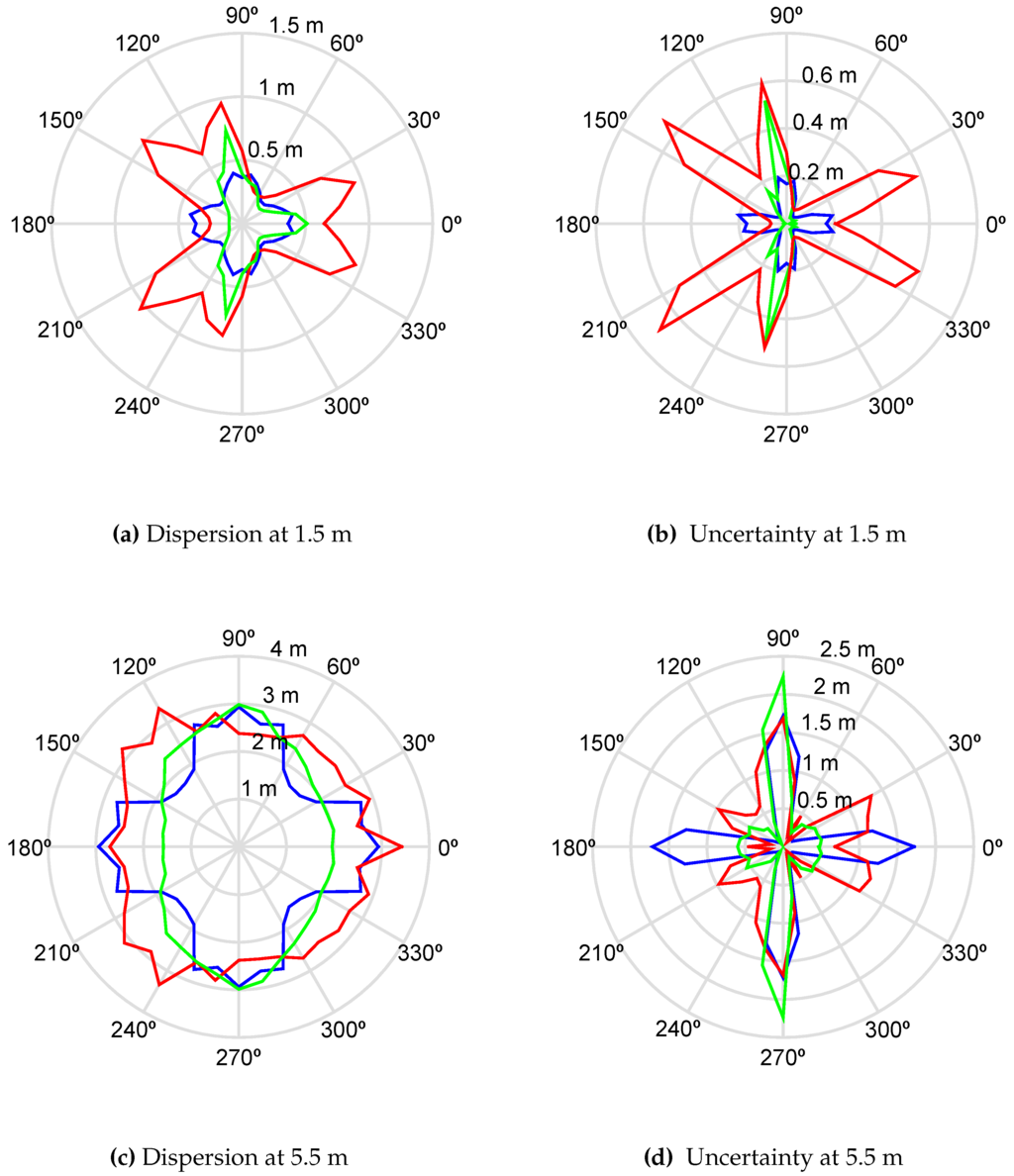 Figure 2 shows the simulation results for dispersion and uncertainty measured in meters of all possible positions of the source when it is actually placed at 1.5 m and 5.5 m from the center of the layout. These polar plots are very helpful to find the directions in which the antennas have the best performance. The red line corresponds to the star formation. The preferable relative positions of the source in terms of dispersion of the results are 60°, 180° and 300°, plot Figure 2a. This means that, when the TDOA have errors of samples, all possible positions of the source are less scattered in those angles. Additionally, plot Figure 2b shows the uncertainty as the mean of all possible positions with respect to the actual position of the source. The best performance of the star formation is again in the same directions as in the dispersion plot plus 0°, 120° and 240°. When the distance is increased to 5.5 m, the measure of the scatter tends to be uniform in all directions, plot Figure 2c.