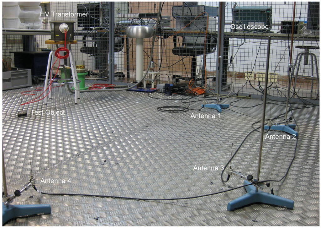 The three antenna array layouts were tested in a laboratory, Figure 3. The antennas were monopoles 10 cm long which are omnidirectional and have good response in the range of frequencies where partial discharges emit [24]. All coaxial cables have the same length and are connected to an oscilloscope with four channels.