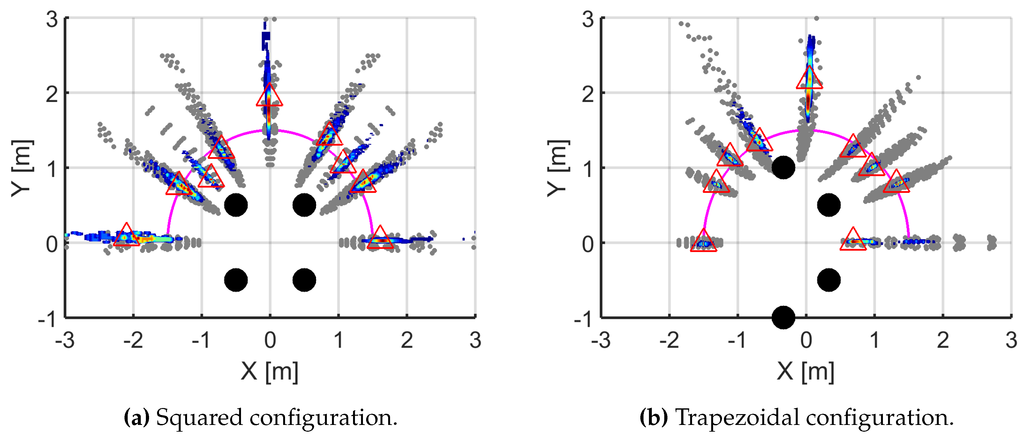 Considering that the star array had a poor simulated performance, the experimental measurements were taken only for the formations in square and trapezoid. The partial discharges source was placed in selected points on a semi-circumference around the antennas and the radius was set to 1.5 m due to room constraints in the laboratory. The results are shown in Figure 4 where the magenta line represents the positions of the source. The grey points are the outcome of the simulations when the TDOAs have errors of one sample; the points with colors ranging from dark blue to dark red correspond to the solutions given by the PSO for the TDOAs calculated from actual pulses. Dark blue points means that the concentration of solutions is low whereas dark red ones means that there are many solutions in that area so the source would very likely be there. The triangles mark the mode of all experimental solutions which would be where the source is located based on those measurements.