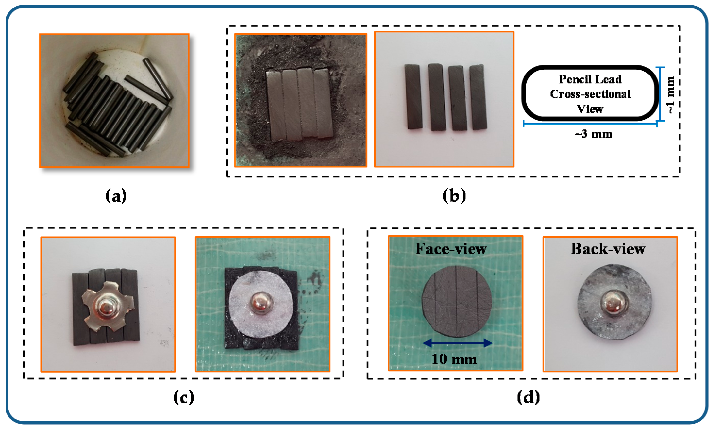 - The 4B pencil leads were used as a material for making PLS electrodes. The pencil leads were cut into pieces as shown in Figure 2a.