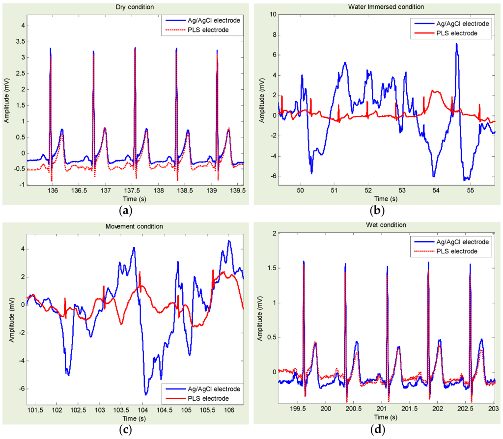Figure 7 shows approximately 5-s ECG data measurements using PLP and Ag/AgCl electrodes for each step: dry, freshwater immersion with/without movement, and freshwater wet condition. It is also shown that the PLP electrodes provided all morphological components of ECG signals, in all conditions. Similar to PLS, in freshwater immersion with/without movement conditions, the ECG signal from PLP provided better quality than the one from Ag/AgCl, which is almost indiscernible.