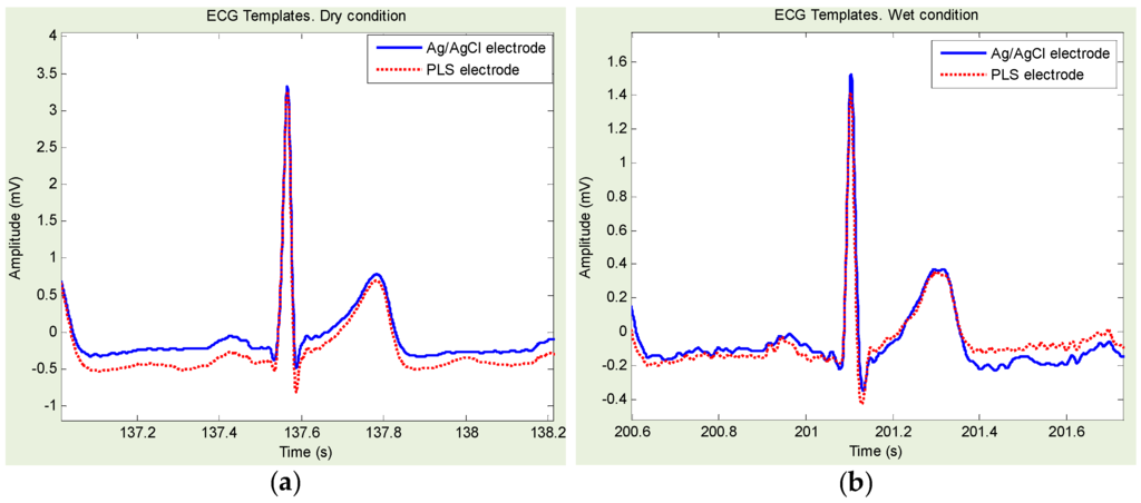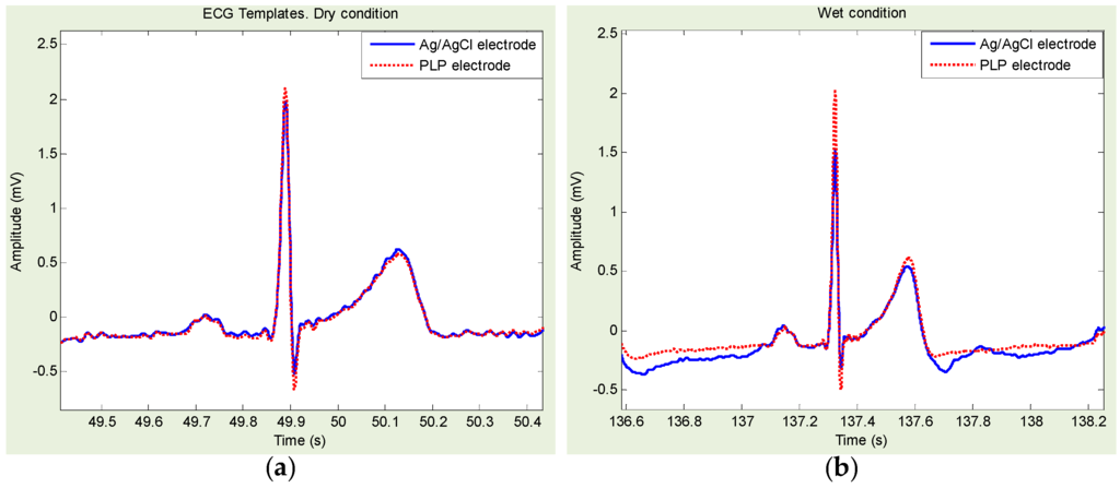 Figure 8 shows an example of Ag/AgCl- and PLS-based ECG template directly derived from Figure 6a,d. Similarly, Figure 9 shows an example of Ag/AgCl- and PLP-based ECG template directly derived from Figure 7a,d. Ag/AgCl electrodes were good for dry and wet conditions. However, for the freshwater immersion with/without movement condition, the signals were hardly recognized, and the R-wave was almost indiscernible.