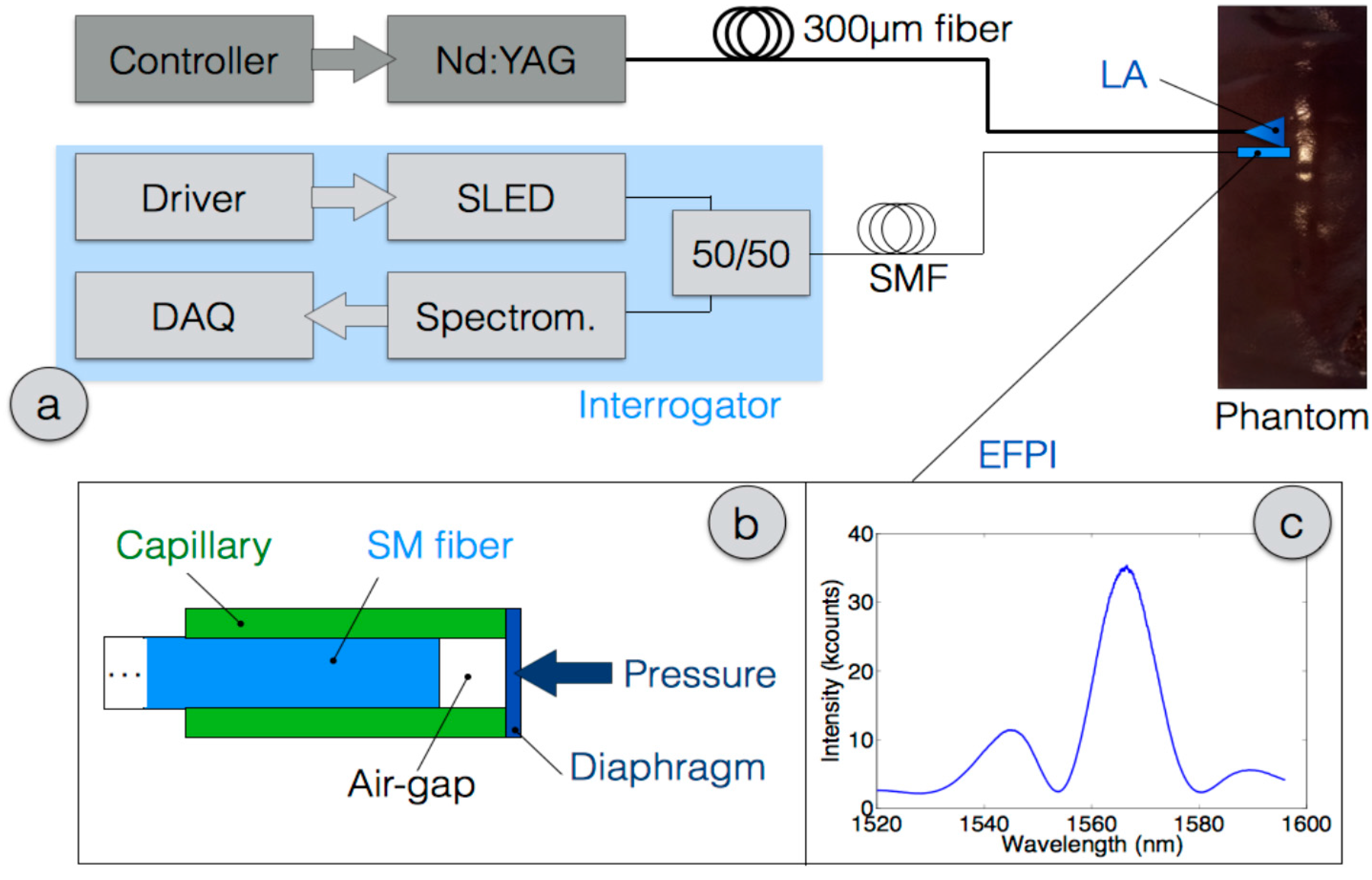 Schematic of the LA on animal phantom, and EFPI pressure detection: (a) Schematic of the system; (b) Sketch of the EFPI all-glass probe; (c) Spectrum of the EFPI probe.