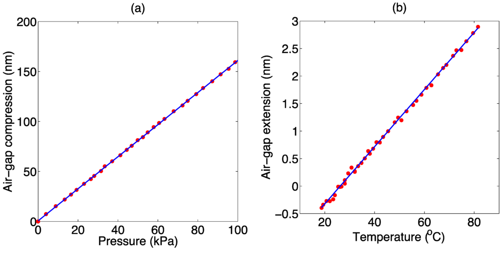 Figure 2b reports the thermal calibration performed in a temperature chamber, from 18 °C to 82 °C; the slope of the curve is estimated as 52.2 pm/°C. In absence of fluctuations of refractive index of the outer medium, pressure measurement yields accuracy better than 0.1 kPa [