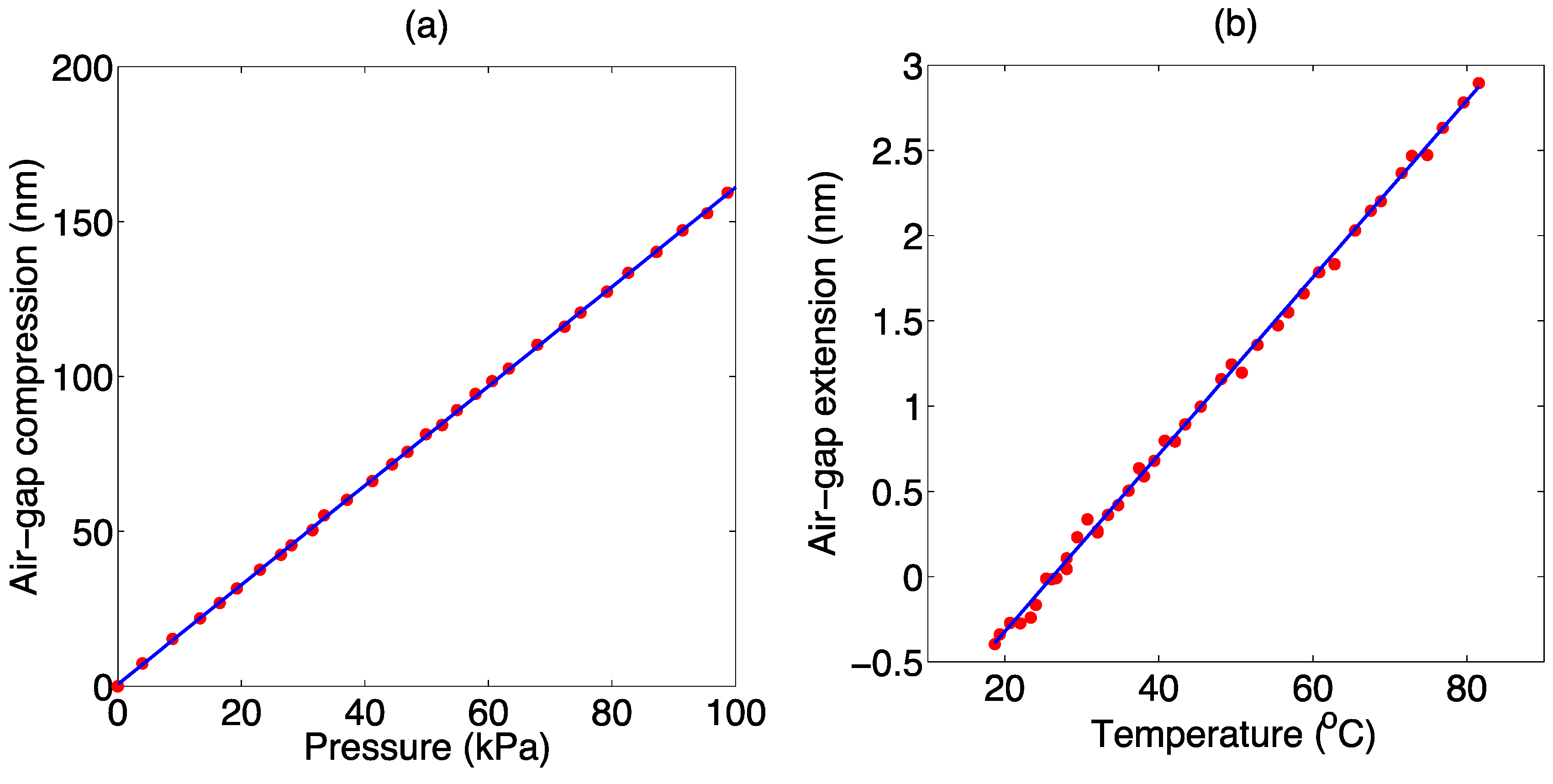 EFPI probe calibration. (a) Pressure calibration, reporting the Fabry-Perot cavity compression as a function of pressure, applied in an air tank at constant temperature; (b) Temperature calibration, reporting the cavity expansion factor as a function of applied temperature, in a thermal chamber, with no pressure variation.