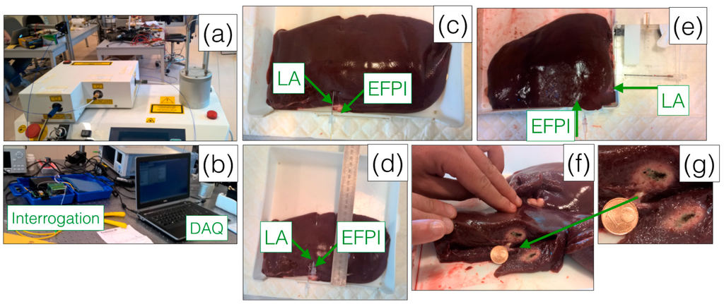 Figure 3 shows a series of photographs of the experimental setup, fiber insertion, and ablation outcome. In particular, the insertion of the EFPI probe into the tissue is shown: a needle is firstly inserted to guide the fiber into the tissue, and subsequently removed to leave the fiber in place. With this setup, no fracture or damage to the probe, despite its miniature size, was observed. The setup mimics