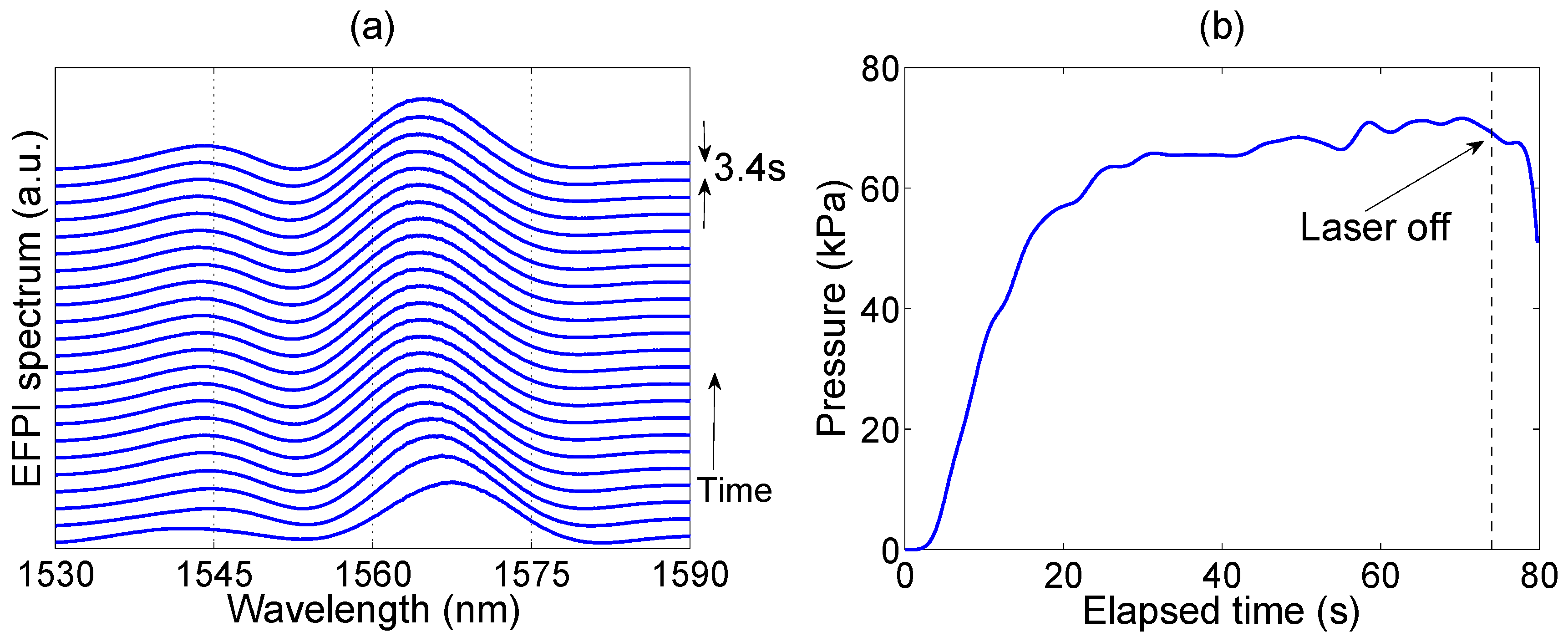 First experiment in pressure detection in LA. (a) The chart reports EFPI spectrum evolution (from the bottom to the top), as acquired by the interrogator, sampled each 3.4 s; (b) The estimated pressure is then reported as a function of elapsed time, with laser turned on at 0 s and turned off at 74 s.