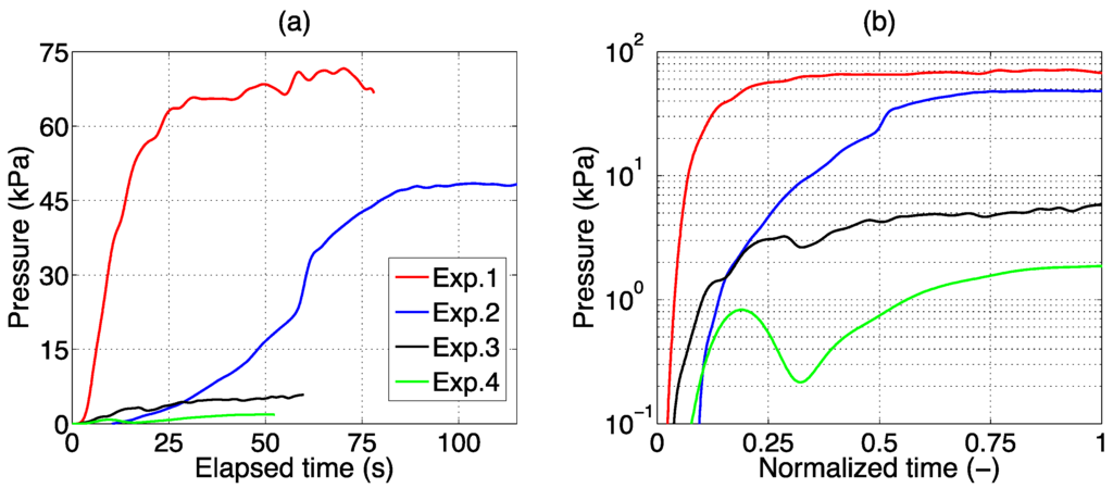 25]: in the third experiment, pressure reaches a peak of 5.8 kPa, while in the last experiment, pressure changes appear to be minute (1.9 kPa peak).