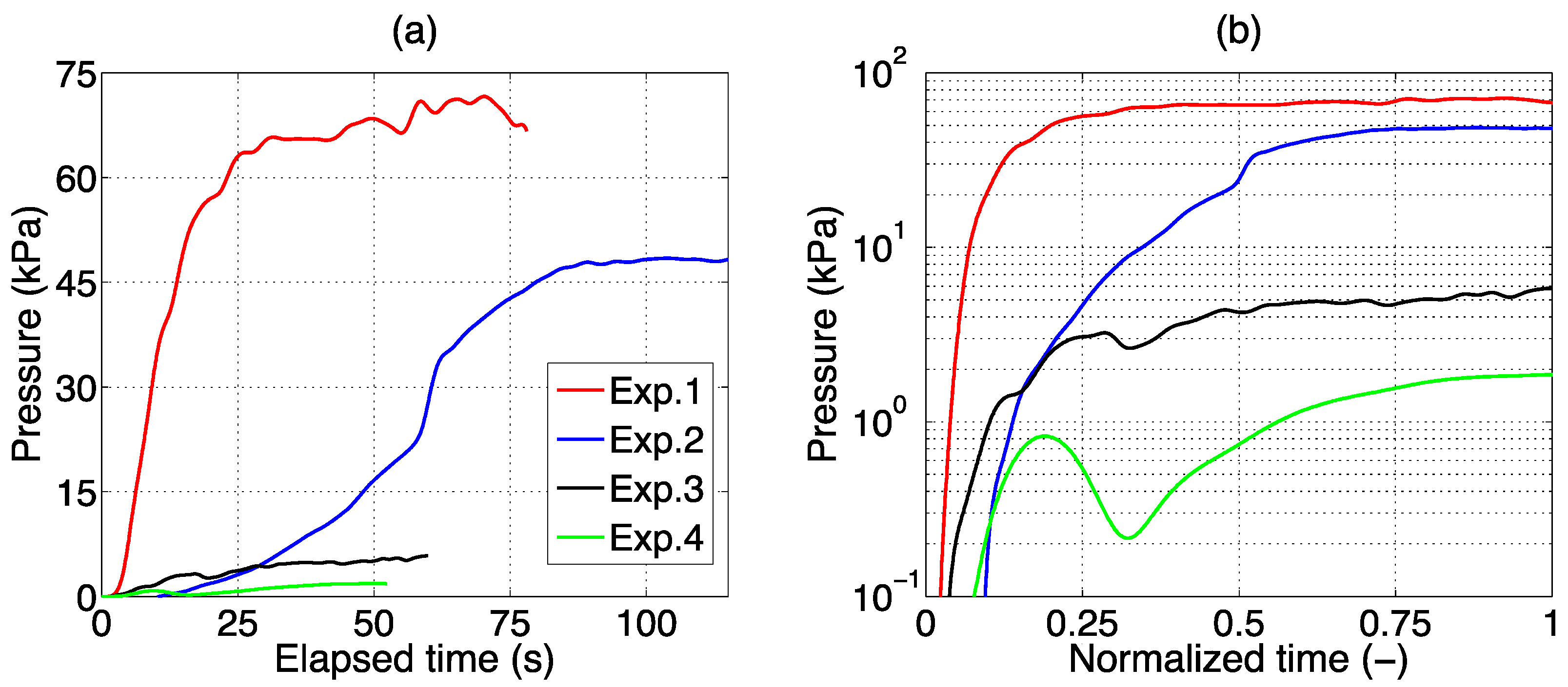 Evolution of pressure recorded by the EFPI probe, in four different LA experiments as outlined in Table 1. (a) Pressure chart for each experiment, reported from the start of the procedure to the final stage; (b) Pressure is reported, in logarithmic units, as a function of time, normalized between the values of 0 (laser on) and 1 (laser off).