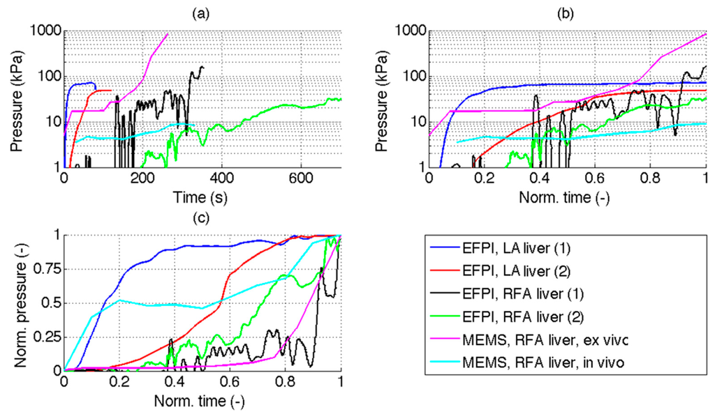 21] is not included in the table and chart, due to the lack of information on the pressure sensor and temporal pressure charts. These, to the best of our knowledge, are the only results related to intra-tissue pressure measurement in mini-invasive thermal ablation designed for cancer care; all of them are related to hepatic tissue RFA.