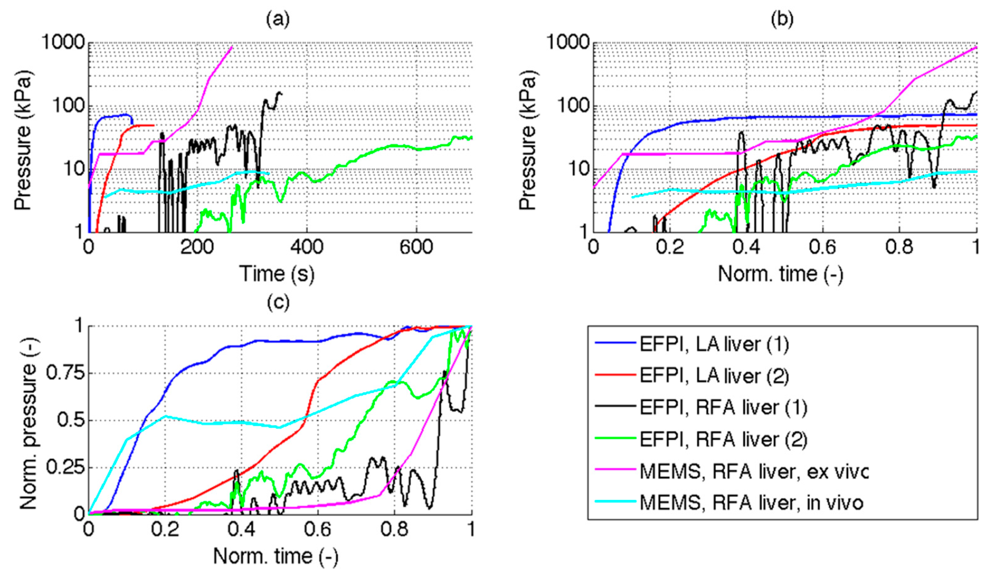 In Table 1, the comparison among results achieved by current and previous studies is performed considering the peak-pressure value (i.e., the maximum value of pressure measured at the end of the ablation procedure), and the 75% of peak (i.e., normalized time for which the pressure value is 75% of the peak pressure). Moreover, the comparisons of pressure/time charts are reported in Figure 6, including: (a) original data; (b) time-normalized data; (c) normalization of both pressure and time.
