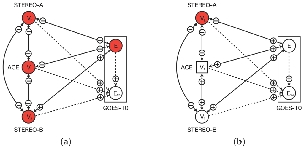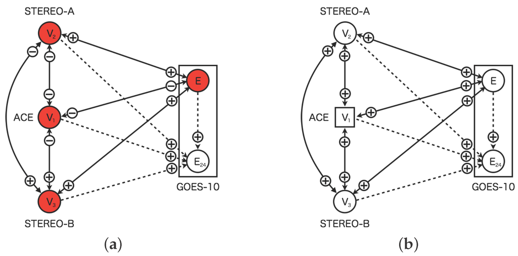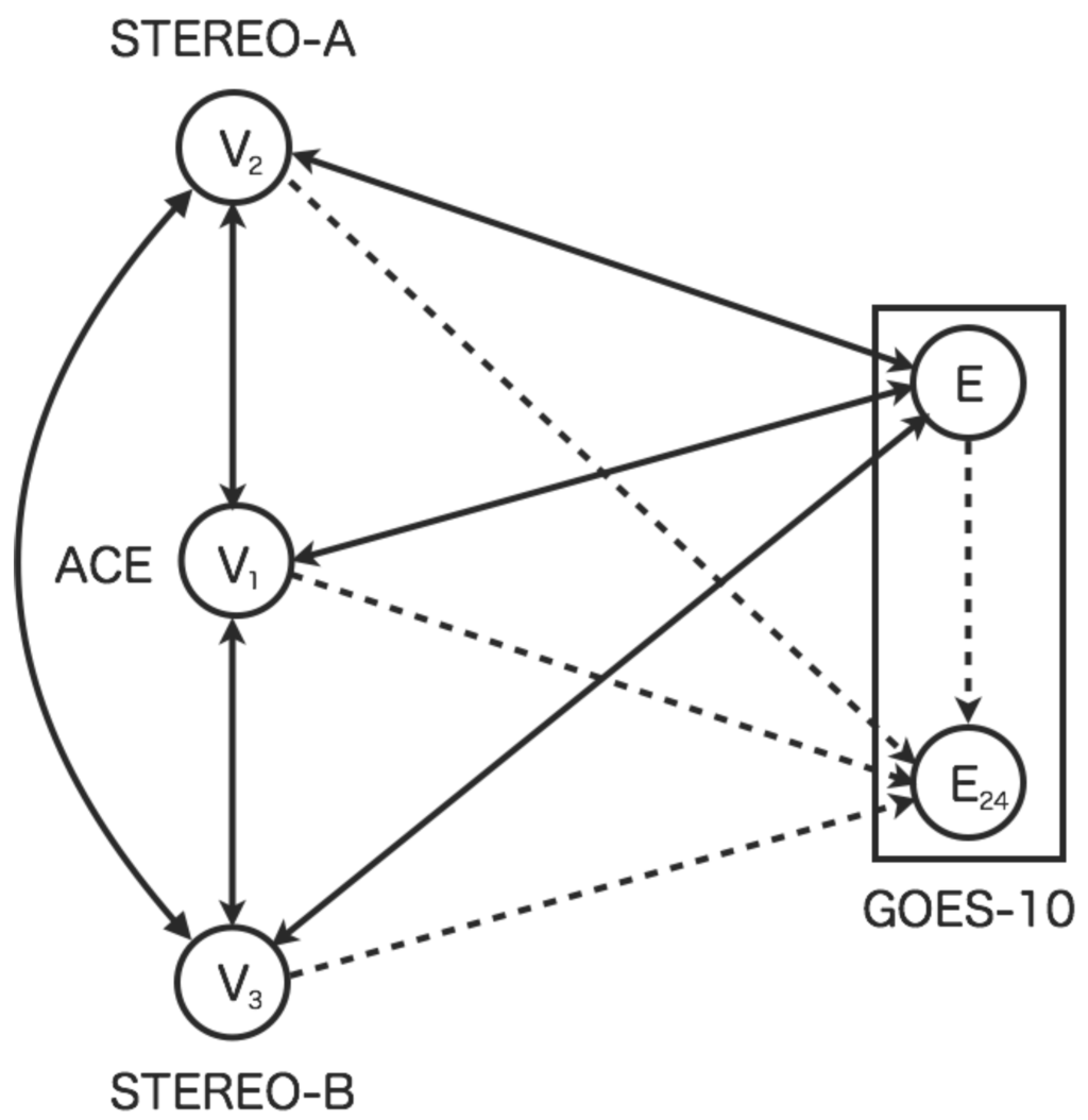 Figure 1 shows the sensor network based on the dynamic relational network. The sensor network consists of the five sensors: four real sensors and one virtual sensor. The sensors of (STEREO-A), (ACE), and (STEREO-B), which represent the solar wind speed. The sensor E (GOES-10) represents high-energy electron flux at geostationary orbit. The virtual sensor represents the high-energy electron flux 24 h in advance. The real sensors diagnose its state each other. However, the diagnosis by virtual sensors is different. The virtual sensor for prediction does not diagnose other sensors, while the virtual sensors for interpolation do it each other.