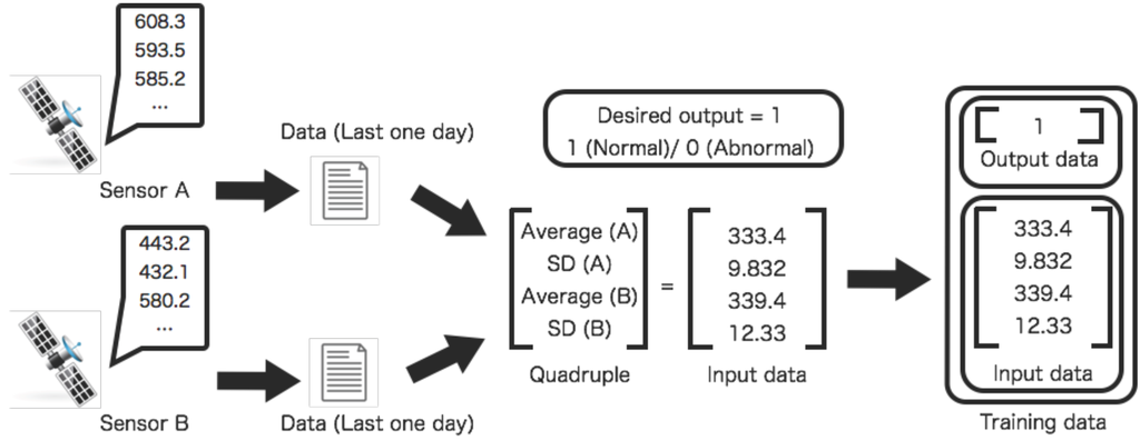 Training data generation process for two sensors. The training data of the sensors are created from the observed data. The training data consists of averaged values, their standard deviations, and the desired output.