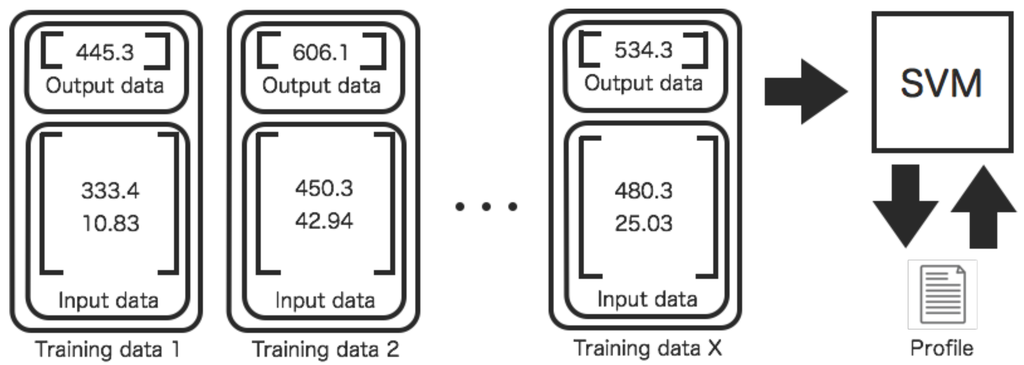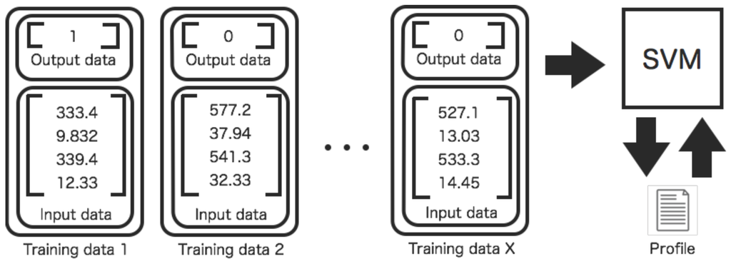 Training process of a profile between two sensors. The training data set are input to an SVM. The SVM learns desired outputs from the training data set.