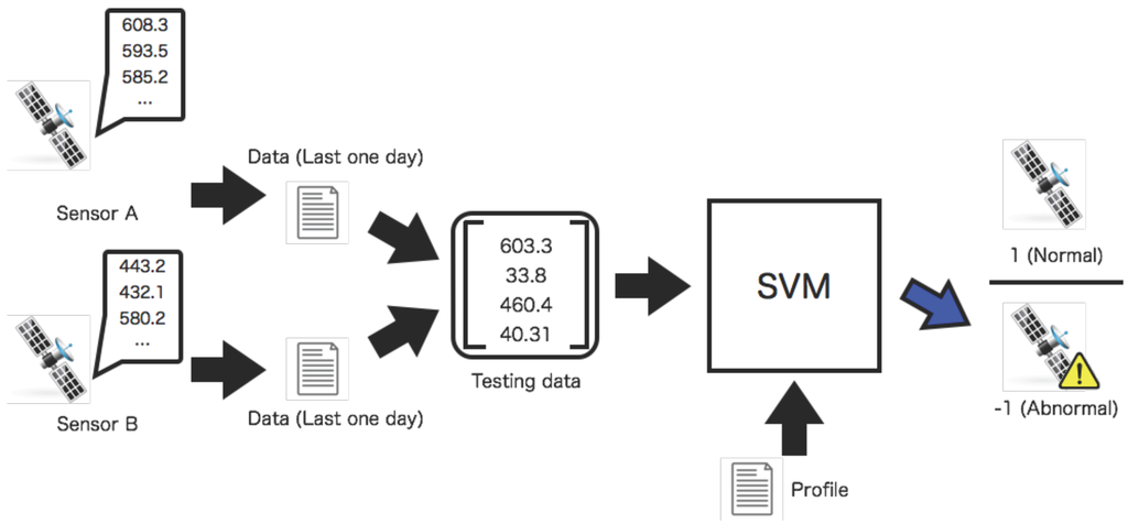 Test of observed data recorded by two sensors. The test data are input to an SVM based on the profile. The SVM classifies the condition of the space environment as binary values 1 (normal) or −1 (abnormal).