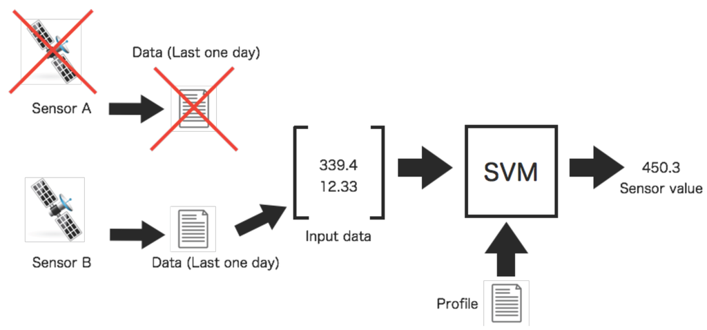 Training process of a profile between two sensors for spatiotemporal interpolation of missing data. The training data consisting of tuple data set are input to an SVM. The SVM learns desired outputs (interpolated value) from the training data set. This profile is used for interpolation. On the other hand, the profile shown in Figure 3 is used for evaluating relations between two sensors.