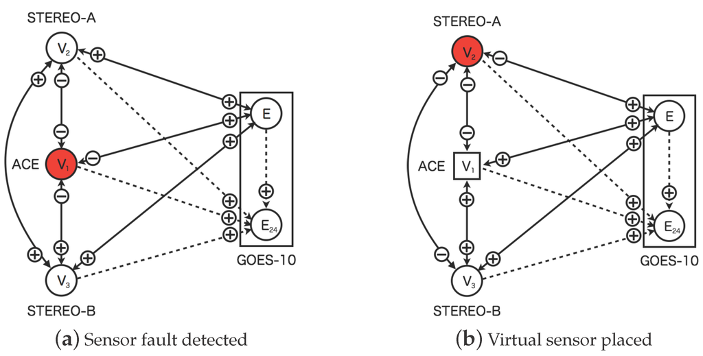 Figure 7 shows the replacement process of the faulted sensor in the dynamic relational network. In the proposed model, the sensors are diagnosed from other sensors connected. The neighbor sensors would identify the faulted sensors as abnormal by the distributed manner. The faulted sensor is disjointed from the dynamic relational network where the sensor status identified as abnormal for 24 h continuously. In Figure 7a, the solar-wind sensor of ACE is diagnosed as abnormal from other three nodes. In Figure 7b on the other hand, the solar wind sensor of ACE is replaced a circle node to rectangle one. The rectangle node indicates the virtual sensor behaving as virtual sensor which is created from information of neighbor nodes. The virtual sensor is also diagnosed from other sensor nodes.