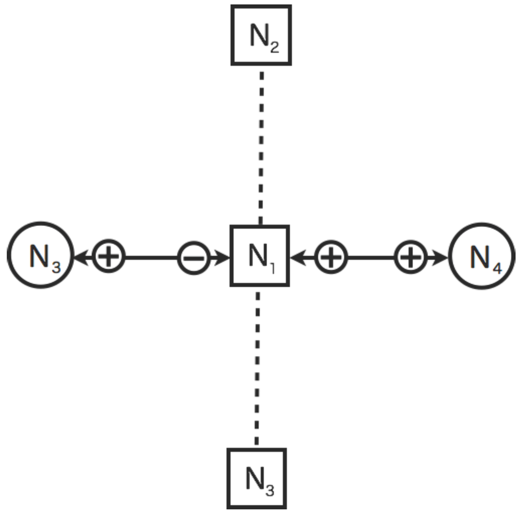 An illustrative example of a constraint on virtual sensors in the dynamic relational network. The circles and squares indicate the real and virtual sensor nodes respectively. The sensor nodes colored white is normal. The solid lines indicate diagnosis flow of mutual diagnosis. The dashed line indicate diagnosis flow from real sensors to virtual sensors. The plus (minus) indicate the diagnosis result as normal (abnormal) from the source node to the target node.