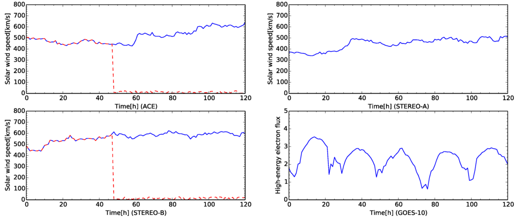 Time development of the test case for five days from 1 May 2008 at 00:00:00 UTC. The satellite names are labeled in horizontal axes. The plots in the first row and left one in the second row show the time development of solar wind speed. The right plot in the second row shows the time development of the high-energy electron flux. The solar wind plots for ACE and STEREO-B also show the abnormal data for the test (dashed line).