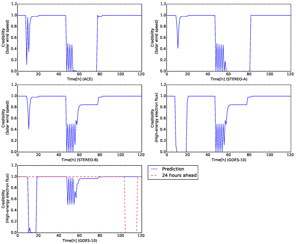 In this case study, the sensor of ACE for the solar wind speed is faulted at 48 h from the beginning of the time development. Figure 10 shows the time development for the test case. The credibility of the solar wind speed observed by ACE, STEREO-A, and STEREO-B show rapidly decrease to less than 0.4 at the beginning of the simulation. Because the sensors of the solar wind speed also detected its rapid increase. The high-energy electron flux also decreases to small values. This change of the credibility corresponds to rapid increases of the high-energy electron flux and the solar wind speed observed by STEREO-B because the flux level grows to around 4.0 of the alarm level []. During this change, the virtual sensors for interpolation is not appeared.