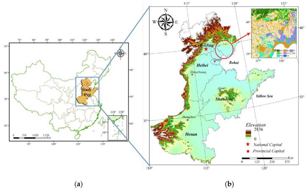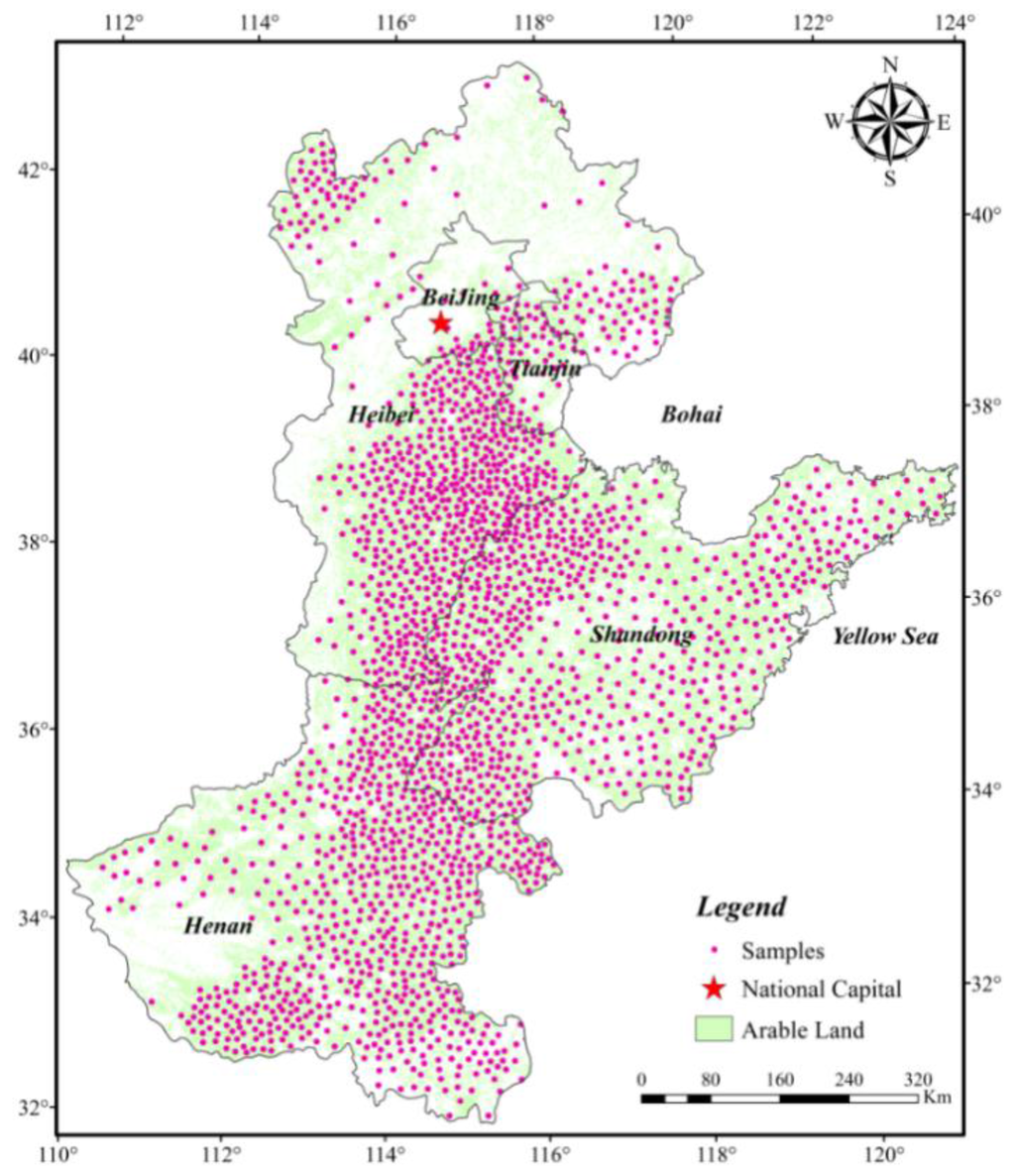 The NCP of Northern China forms one of the largest plains in eastern Asia. Most of the NCP is less than 50 meters above sea level, and serves as one of the major food-producing regions in China. It extends over the municipalities of Beijing and Tianjin, and includes much of Henan, Hebei, and Shandong provinces, as well as parts of northern Jiangsu and Anhui provinces; these last two provinces are not included in this study. The studied ranged across 31.6°N–42.5°N and 110.4°E–122.6°E (Figure 1). The flat, open typical fluvial NCP has many rivers and lakes, and is composed of very deep alluvial deposits, principally re-deposited loess resulting in fertile soil. Most of its area experiences a warm temperate continental monsoon climate with four distinct seasons, and features relatively abundant light and heat resources. The annual average temperature is 12–15 °C), with an annual accumulated temperature (≥0 °C) of 4100–5400 °C, and an annual frost-free period of 190–220 days. This climate can meet the needs of a double cropping system within one year and/or triple cropping system over two years. The average annual precipitation of 500–1000 mm is unevenly distributed over time, and is largely concentrated from July to September. Most of the dryland farmland of the NCP supports a typical cropping practice of mainly rotationally cultivated winter wheat and summer corn. However, farmers may grow other crops such as corn, sorghum, peanuts, vegetables, and cotton and the region exhibits a high degree of regional agricultural development [40].