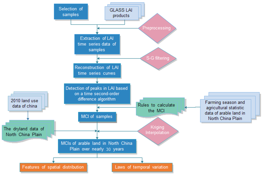 Based on the reflectance spectra of green vegetation in remote sensing imagery, large-area LAIs can be retrieved and easily reveal the growth status and vegetation in an objective area. LAI time-series dataset can represent the intra-year or inter-annual growth characteristics of cultivated crops [48] and through using them, phenological features can be detected. During growth, a crop generally moves through seeding, emergence, jointing, heading, to harvest stages. Therefore, a crop’s LAI values will change from increasing to peaking (perhaps with multiple peaks) to declining. Obviously, a marked peak, two peaks, and three peaks exists in single-cropping, double-cropping and triple-cropping systems, demonstrating the associated dynamic changes of crop growth in each type of cropping system. This allows crop LAI time series curves to be constructed in areas with dry land farming, so that the number of peak(s) can be employed to extract the MCI information [49]. Based on the GLASS LAI long time series products, a scheme has been developed for extracting and analyzing the MCIs of dry land over the NCP in this study (Figure 2).