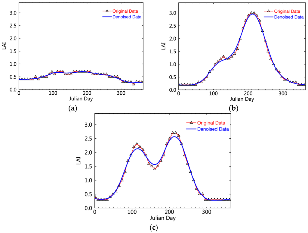 - In addition, the fact that crop LAI growth curves are reconstructed to extract the MCIs using different de-noising methods would lead to uncertainty. Currently, S-G and HANTS filters have been widely applied to smooth the crop growth curves. However, the HANTS method is often greatly influenced by setting many parameters such as frequencies, error thresholds, and number of maximum delete points. As a result, the different parameters based on different types of multiple cropping must be properly set and adjusted, especially in some areas with complicated multi-cropping structures; otherwise, the results of the curve smoothing would be affected. If the related parameters were invariably set, it could not effectively reflect the spatial-temporal real dynamics of the MCIs on a large regional scale [50,62]. In addition, the S-G filtering approach using the least square fitting method can settle the issues quite well. Consequently, in this study the more suitable S-G filtering method was employed to derive the MCIs of dry land in the NCP.