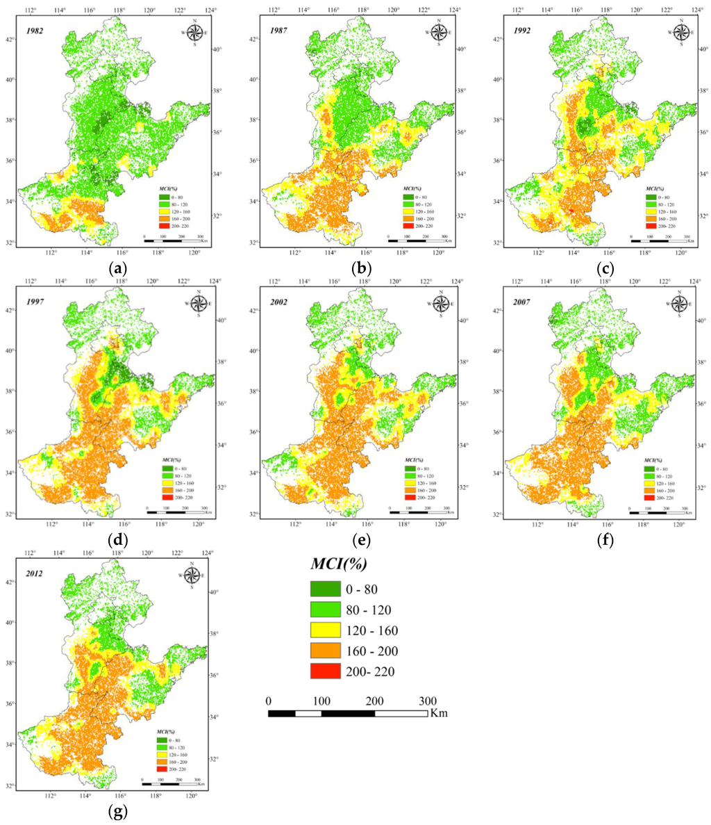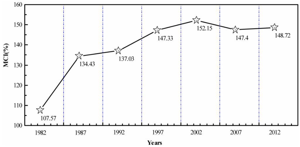 The subregions with MCIs no less than 160% are mainly distributed in northern Henan, western Shandong and southern Hebei which are traditional and important national agriculture development regions [54]. The subregions with higher MCIs are mainly located in relatively flat areas such as the plains in Henan and Shandong provinces. However, the subregions with lower MCIs are mainly distributed in the densely populated and hilly areas with an arid climate [55], including Beijing, Tianjin and mountainous areas in Hebei Province. The variation tendency chart on the temporal scale of MCI in the NCP (Figure 6) was derived from the average MCIs in 1982, 1987, 1992, 1997, 2002, 2007, and 2012. The results show that the MCIs in the NCP had generally continued to increase during the past 30 years. The lowest value of the MCI, 107.57%, appeared in 1982, but the highest value of 152.15% was in 2002. The MCIs significantly increased during the period from 1982 to 2002 (with the largest increase from 1982 to 1987), followed by a slight decline from 2002–2012.