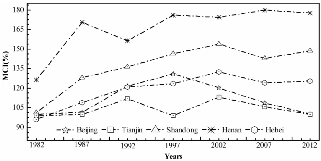 - The MCIs in the NCP retained a stable pattern of growth overall, ranging from 100% to 155% over nearly 30 years. The MCI of dry land in 1982, 107.57%, was minimal, but the value of 152.15% in 2002 was maximal. The MCIs of this region had obvious geographical characteristics that they were high in the southern part of the study area but low in the north. Also, the MCIs in flat terrain were higher than that of mountainous and foothill areas. In addition, the dynamic variation magnitude of the MCIs also had obvious regional characteristics in that the MCI in Henan Province had a largest variation over nearly 30 years while the MCIs of Beijing and Tianjin remained relatively stable.