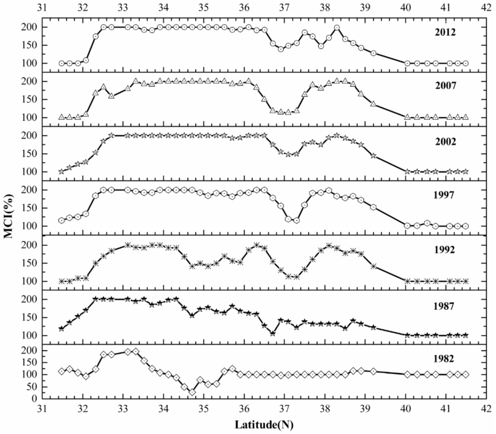 The dry land MCIs were extracted longitudinally along the 115°E Meridian in the NCP over the past 30 years. The MCIs approximately dip from lower latitudes to higher latitudes (Figure 8). The MCIs in the zones from 31.4°N to 32°N, 36.7°N to 37.3°N and 40°N to 41.6°N are relatively lower because of the large area of mountains and hills in these regions (Figure 1). Conditions here led to poorer agricultural conditions and thus multi-cropping has failed to improve crop production over time. In contrast, the MCIs in flat areas from 32.2°N to 36.2°N and 37.6°N to 38.6°N tend to be relatively higher, especially after 1997, and tend to remain relatively stable, including a maximum MCI above 160% in some subregions.