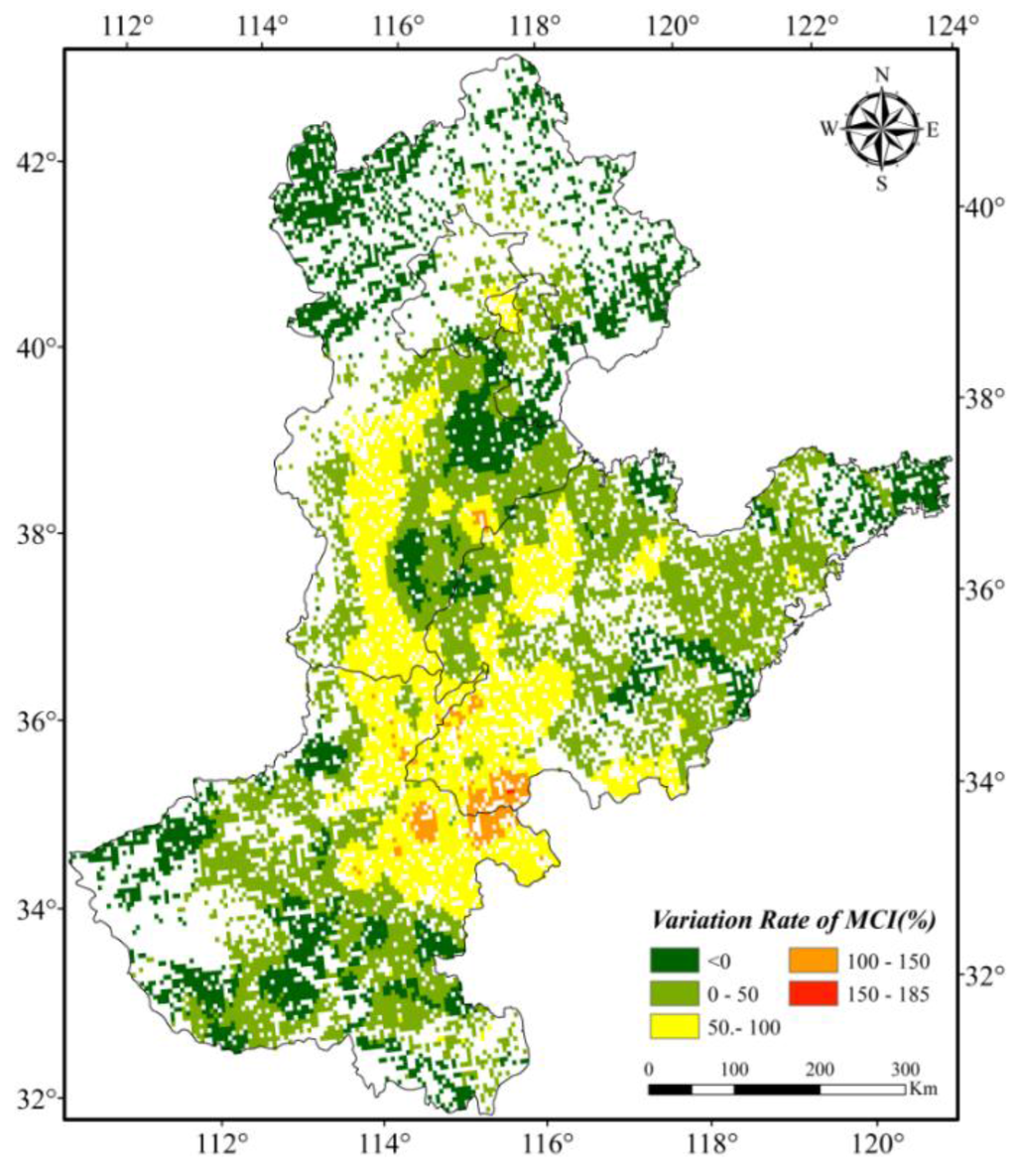 In addition, the annual variation tendency of dry land MCI in the NCP, which was represented by the average change rate of annual MCI in this region for nearly 30 years, was not consistent. It presents a trend that the MCIs have an overall positive growth but those show a negative growth in some provinces (Figure 11). Furthermore, the partial spatial changes of MCIs of the dry land in this region had obvious geographical characteristics; for example, the change of MCIs largest, second largest, and smallest in Henan Province (whose change rate increased by 51.52%), Shandong, and in Beijing (0.32%), respectively.