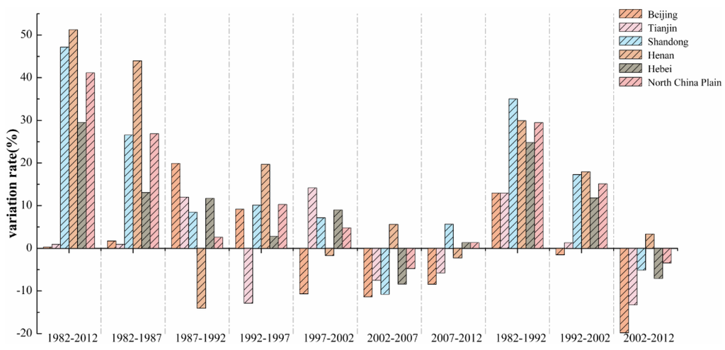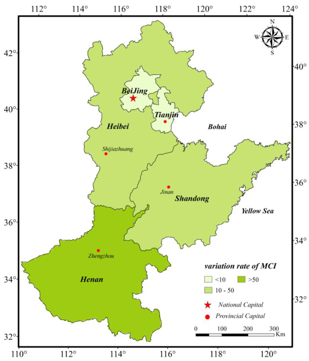 Figure 9 and Figure 10 were created based on MCI change rates to reflect the spatial distribution of MCI ranges in the subareas of the NCP. The MCI change rates of the central plain areas are greater than 50%, and they are even more than 150% in some subareas that are mostly located in the south of Hebei, west of Shandong and north of Henan (Figure 9). However, the MCI variation rates in mountainous areas, coastal regions, and parts of traditionally agricultural regions are very low, and they are less than 10% in some areas. In terms of district level, we can conclude that the MCI change rates from 1982 to 2012 in Beijing and Tianjin which are economically well developed were the least (i.e., less than 10%); meanwhile those of Hebei and Shandong are second, and the MCI variation rate in Henan was the highest (i.e., greater than 50%; Figure 10).