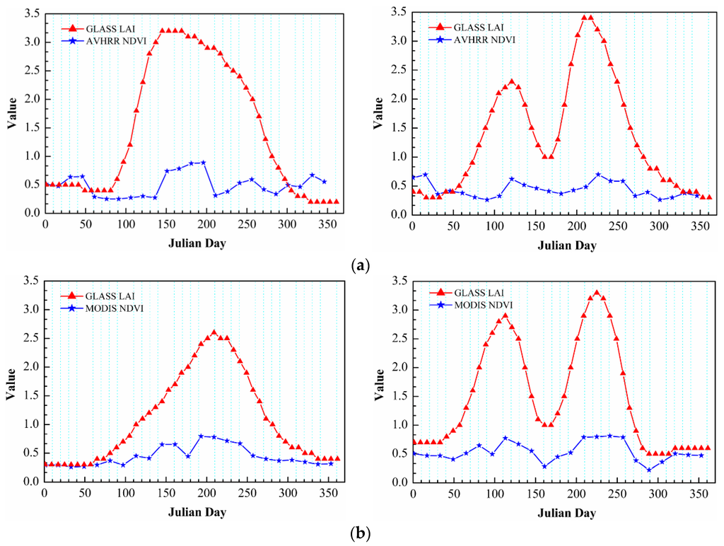 Figure 12. Comparing of Global LAnd Surface Satellite Leaf Area Index (GLASS LAI) with Advanced Very High Resolution Radiometer (AVHRR) and Moderate-resolution Imaging Spectroradiometer (MODIS) Normalized Difference Vegetation Index (NDVI) time series curves in the North China Plain. (a) The comparison between GLASS LAI and AVHRR NDVI time series unimodal (left) and bimodal (right) curves in the NCP; (b) the comparison between GLASS LAI and MODIS NDVI time series unimodal (left) and bimodal (right) curves in the NCP. - (2)