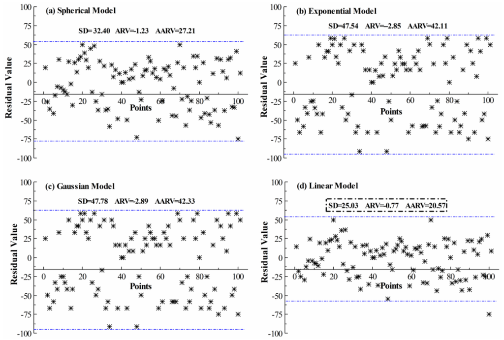 Figure 13. Residual value of different Kriging interpolation modes: standard deviation (SD), average residual value (ARV), and average of absolute residual value (AARV). (a) Spherical Model; (b) Exponential Model; (c) Gaussian Model; (d) Linear Model. - (5)