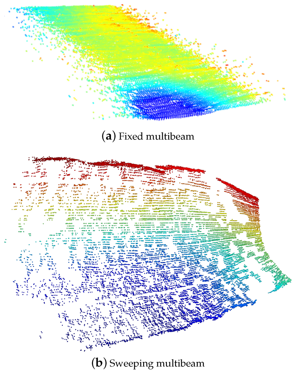 For bathymetric mapping, multibeam sonars are generally fixed to the vehicle so that the 2D swath profiles are generated perpendicular to the surge direction. In that way, 2.5D surfaces are built by composing the multibeam data with the displacement of the vehicle. Alternatively, more complex environments can be inspected by sweeping a multibeam sonar mounted on a pan and tilt unit, so it is the rotation of the sonar head, and not solely the vehicle motion, that leads to the coverage of the surfaces. The point clouds resulting from the collection of multibeam data (Figure 1), along with other information such as boundaries or position with respect to the world, are what we refer to in this work as patches or submaps. This section describes the process of building these submaps during a mission.