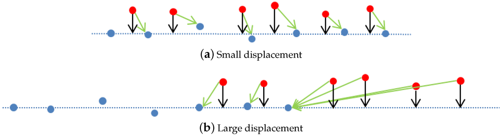 Point-to-point and point-to-plane comparison in the presence of small displacement (a) and large displacement (b). In blue, the points of the reference scan with the plane, in red, the points of the new scan. Green arrows correspond to point-to-point association while black ones represent point-to-plane.