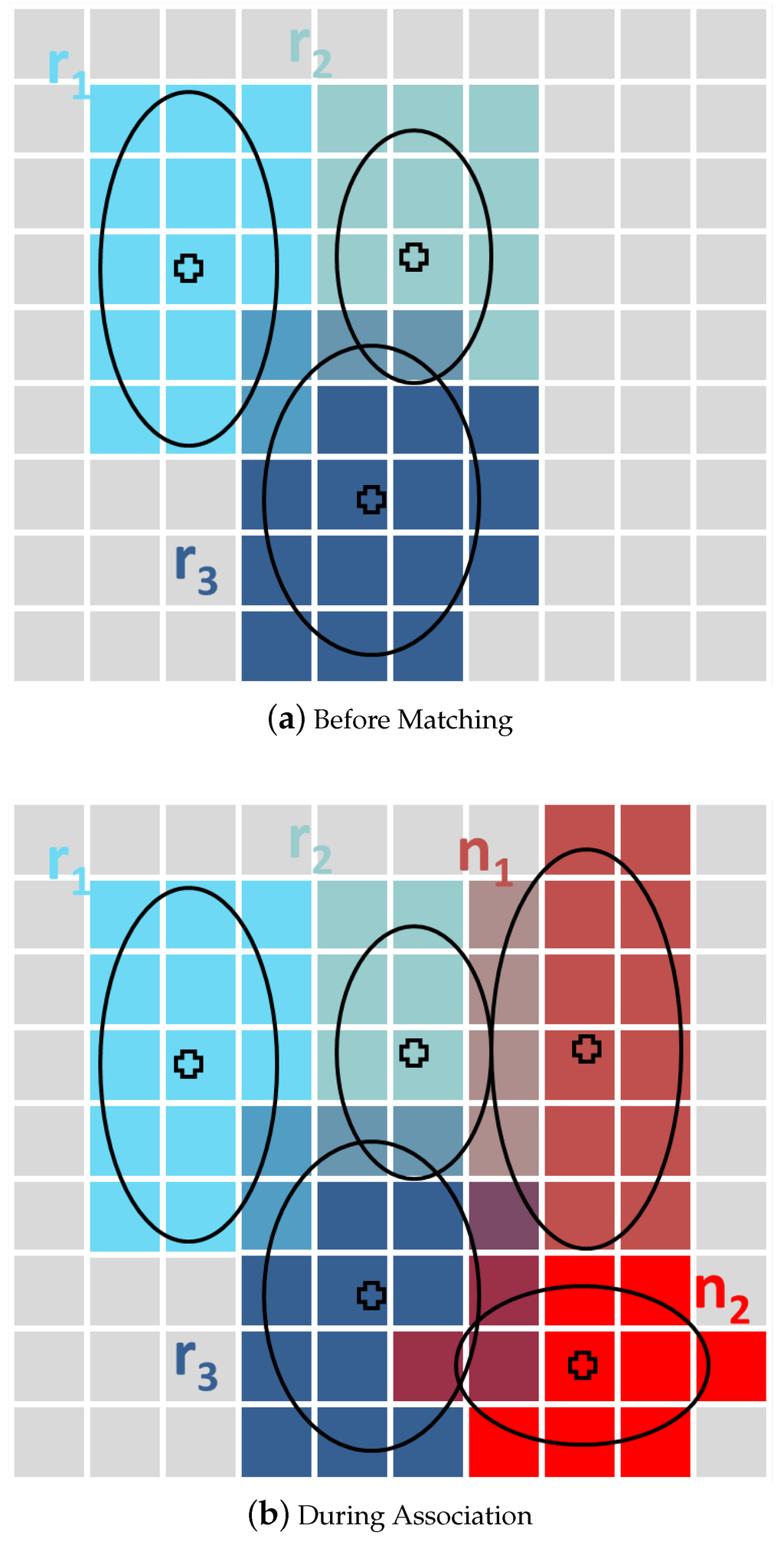 The figure shows how the support grid is used during the association step. First, the points in the reference scan (blue) are inserted into the cells using their uncertainty ellipses (a). Then, each point in the new scan (red) is also laid inside the grid (b). In this case, overlaps with and while overlaps only with . Moreover, has no potential associations.