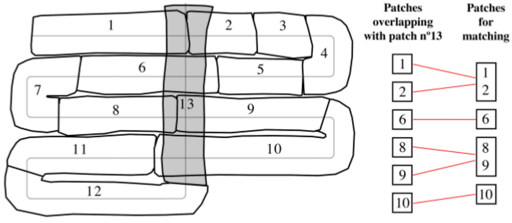 Patch number 13 overlaps with patches 1, 2, 6, 8, 9 and 10. For improving the matching process, patches that are consecutive (1 and 2 as well as 8 and 9) are merged. This results in four patches taking part in the matching process.