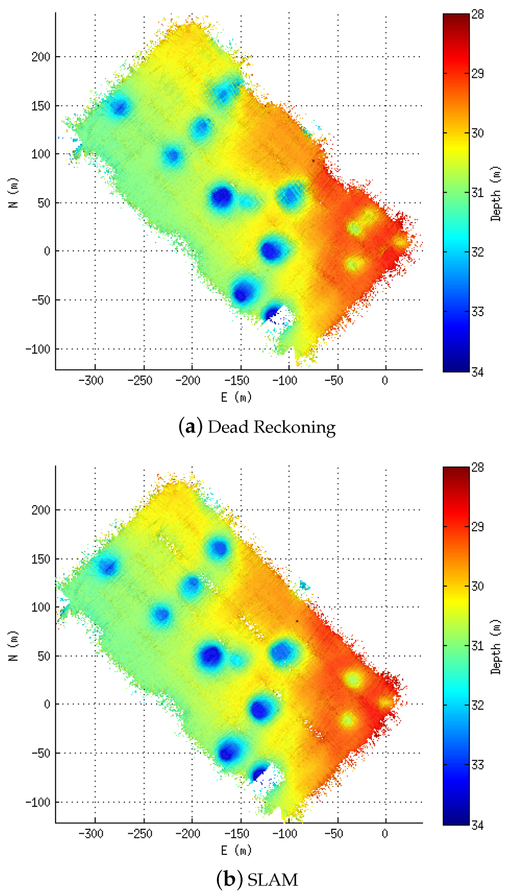 Figure 8 shows the elevation maps built using the dead reckoning navigation (Figure 8a) as well as the one obtained with the proposed technique (Figure 8b). In these two maps, it is possible to observe several differences in the pockmarks. While in the corrected solution (Figure 8b), the pockmarks appear clearly and without much bathymetry-related artefacts on the dead reckoning map, and they are blurred and with some artefacts.