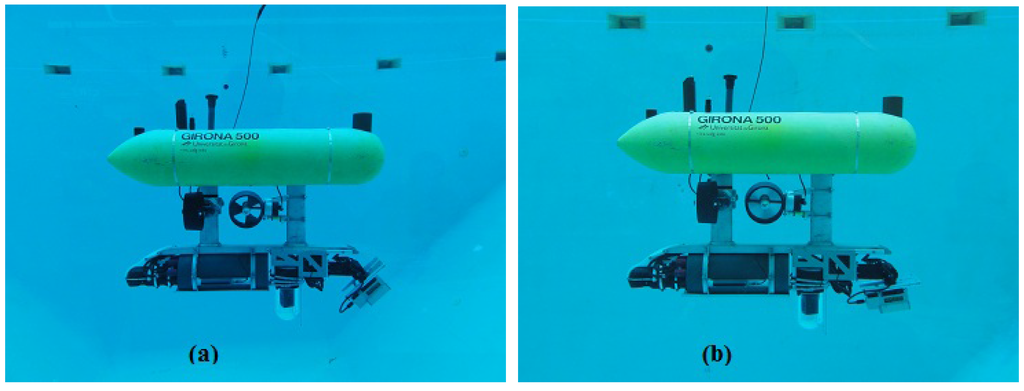 The Girona 500 AUV in the water tank with the configuration used for the experiments. The multibeam sonar and the pan and tilt unit can be seen at the lower-right side of the vehicle facing in two different directions. In (a) the multibeam is tilted at a pitch of around 45° while in (b) it is in a downward-looking position.